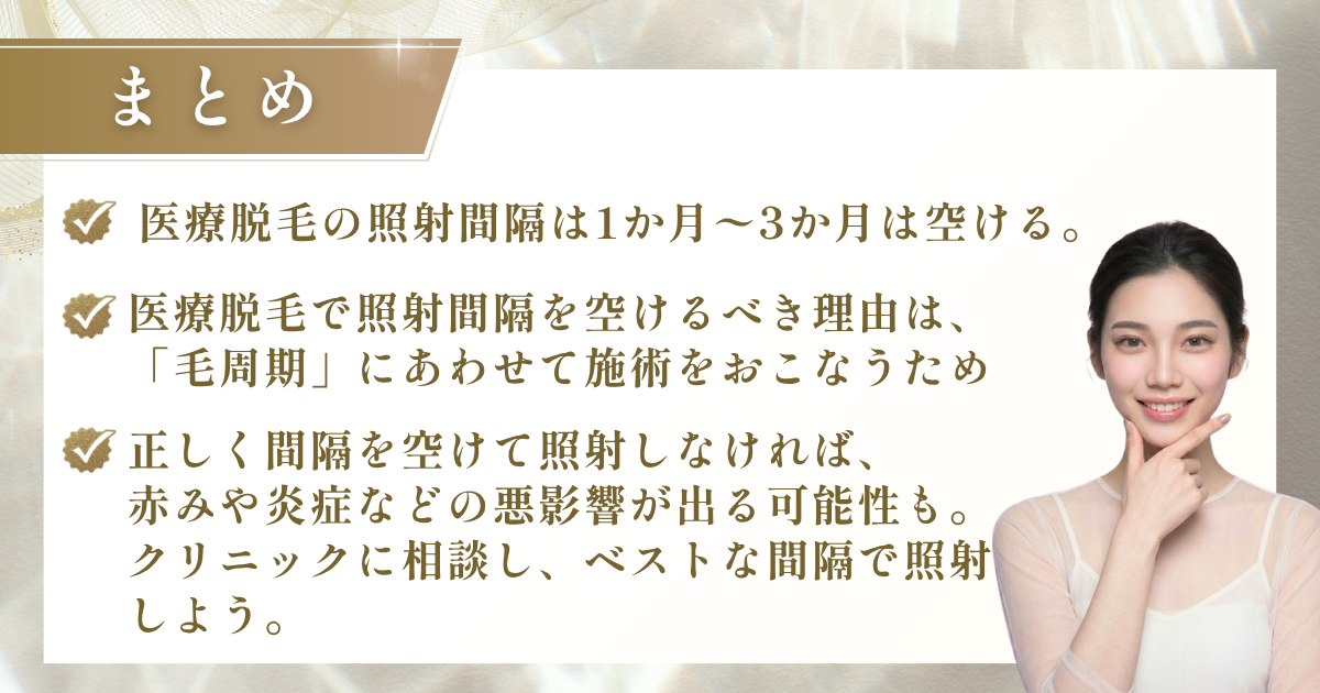 この記事では、医療脱毛のベストな照射間隔やベストな間隔で照射しなかったときの影響、医療脱毛をはじめるタイミング、おすすめのクリニックなどを紹介しました。