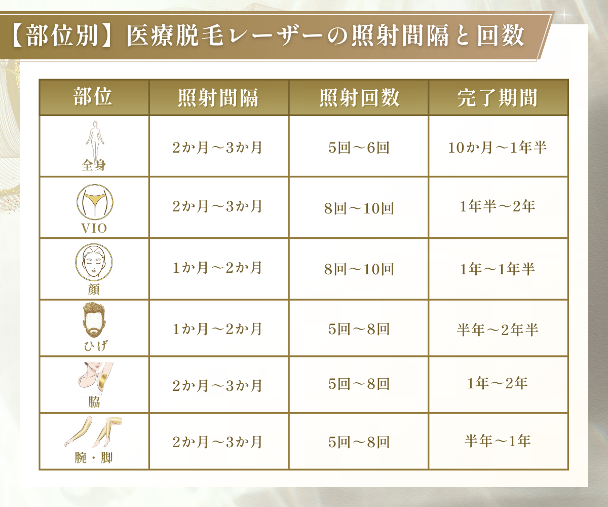次に、部位別の医療脱毛レーザーの照射間隔や回数、完了までの期間の目安を解説します。