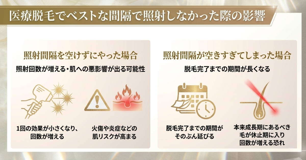 医療脱毛を適切な間隔を空けずにおこなった場合は、照射回数が増えたり肌への悪影響が出たりする可能性があります。
