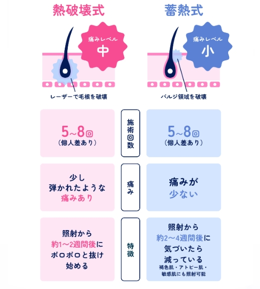 医療脱毛には大きく分けて「熱破壊式」と「蓄熱式」という2つの照射方式があり、それぞれ効果の出方や得意な毛質が異なります。