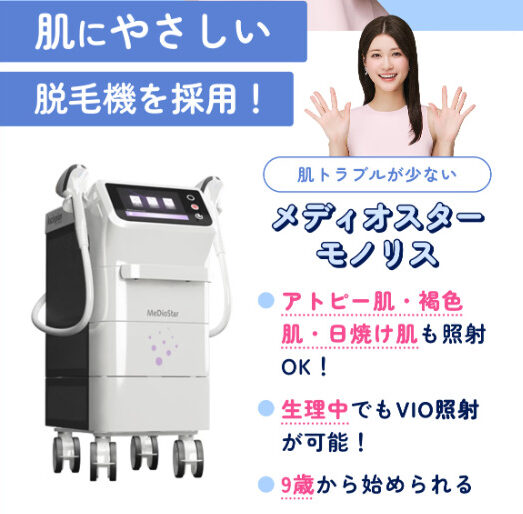フレイアクリニックでは、主に「メディオスターNeXT PRO」および「メディオスターモノリス」という脱毛機を導入しています。